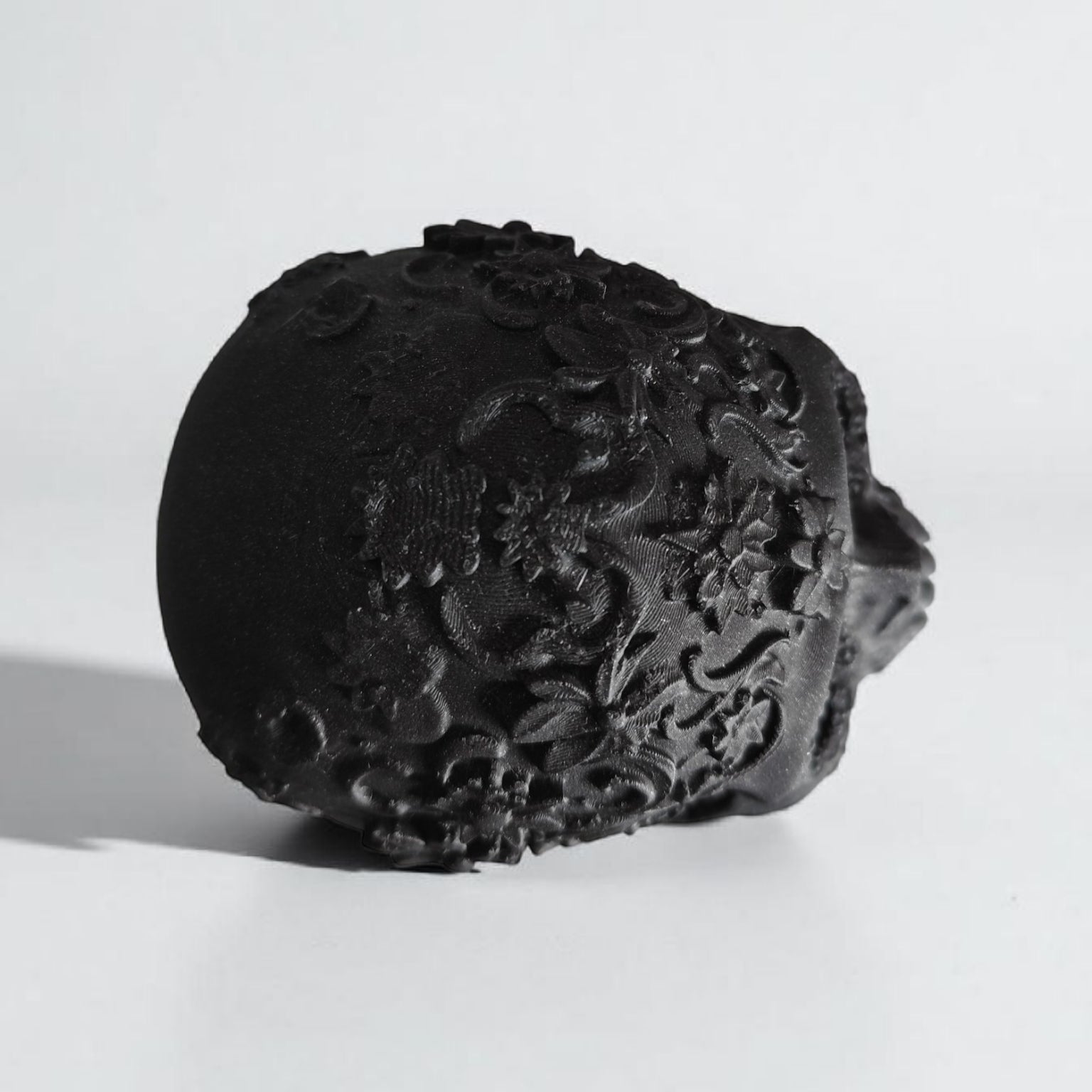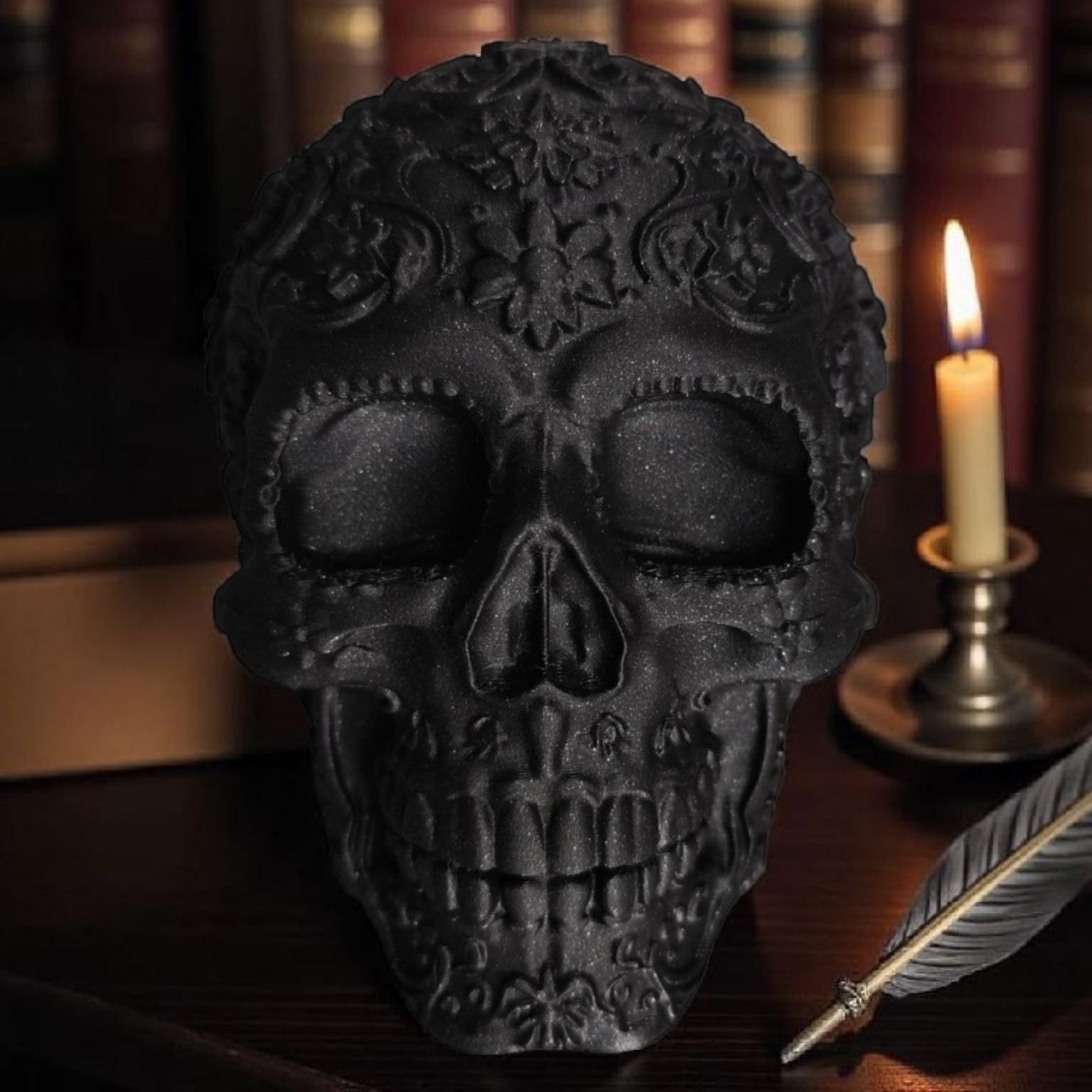 En detaljrik och elegant dekorerad dödskalle i mexikansk stil – lika mycket konstverk som dekoration.
