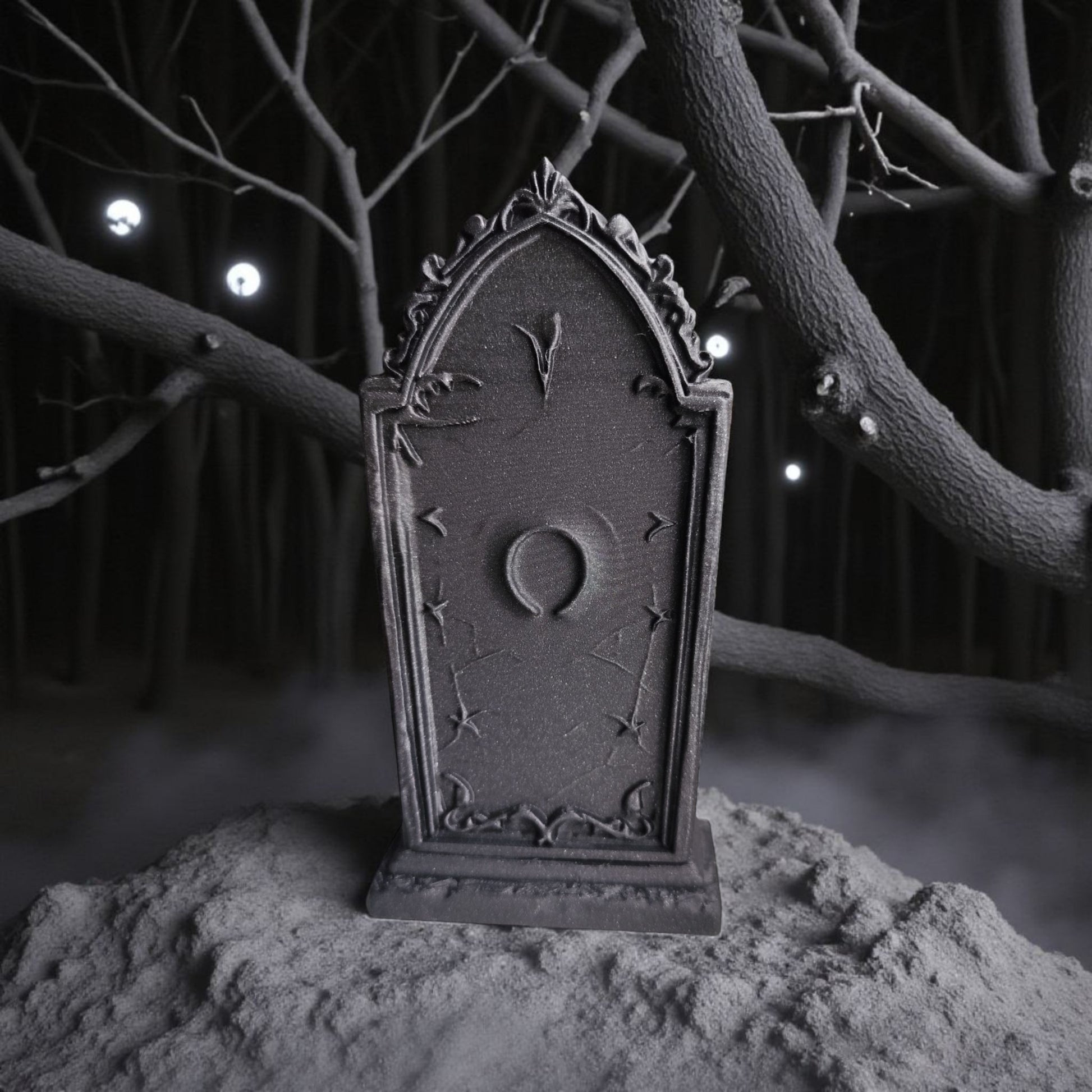 En detaljrik dekoration som för tankarna till en gotisk kyrkogård i månljus. Denna gravsten är fylld av ornament, skallar och stämning – perfekt för att skapa en kusligt elegant atmosfär hemma, i skyltfönstret eller bland dina andra Halloween-dekorationer.