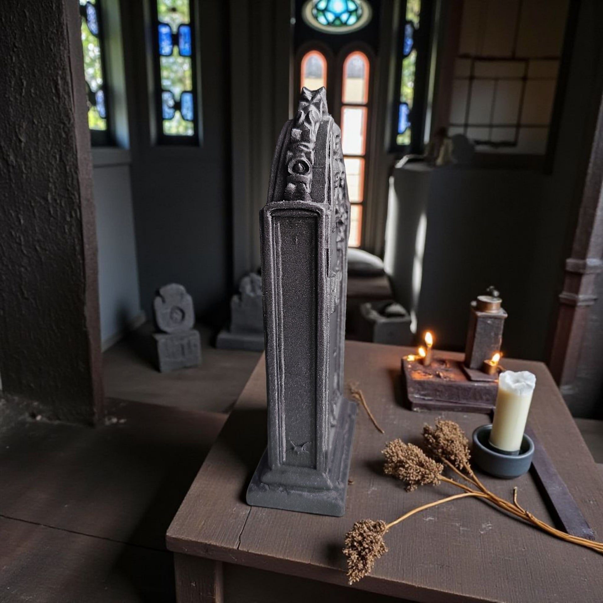 Gravstenen står stadigt på sin bas och passar lika bra på ett bord som i ett större Halloweenarrangemang.