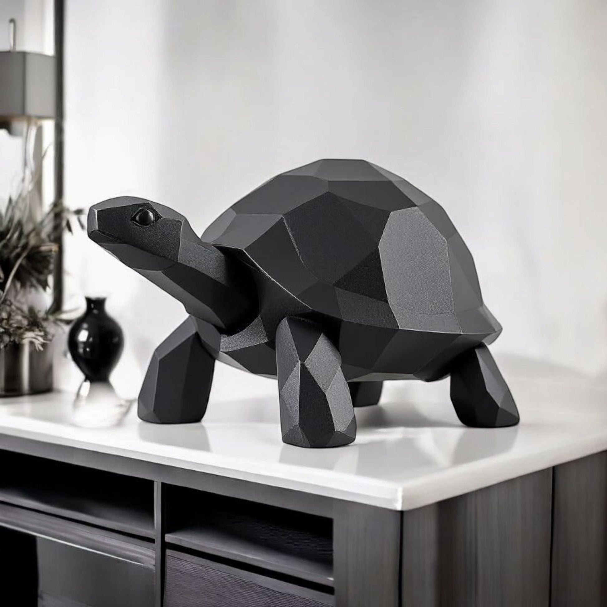 En stilren tolkning av en vandrande sköldpadda i modern low poly-design. Den rena geometriska formen gör den till en dekorativ detalj som passar lika bra i vardagsrummet som ute i trädgården.