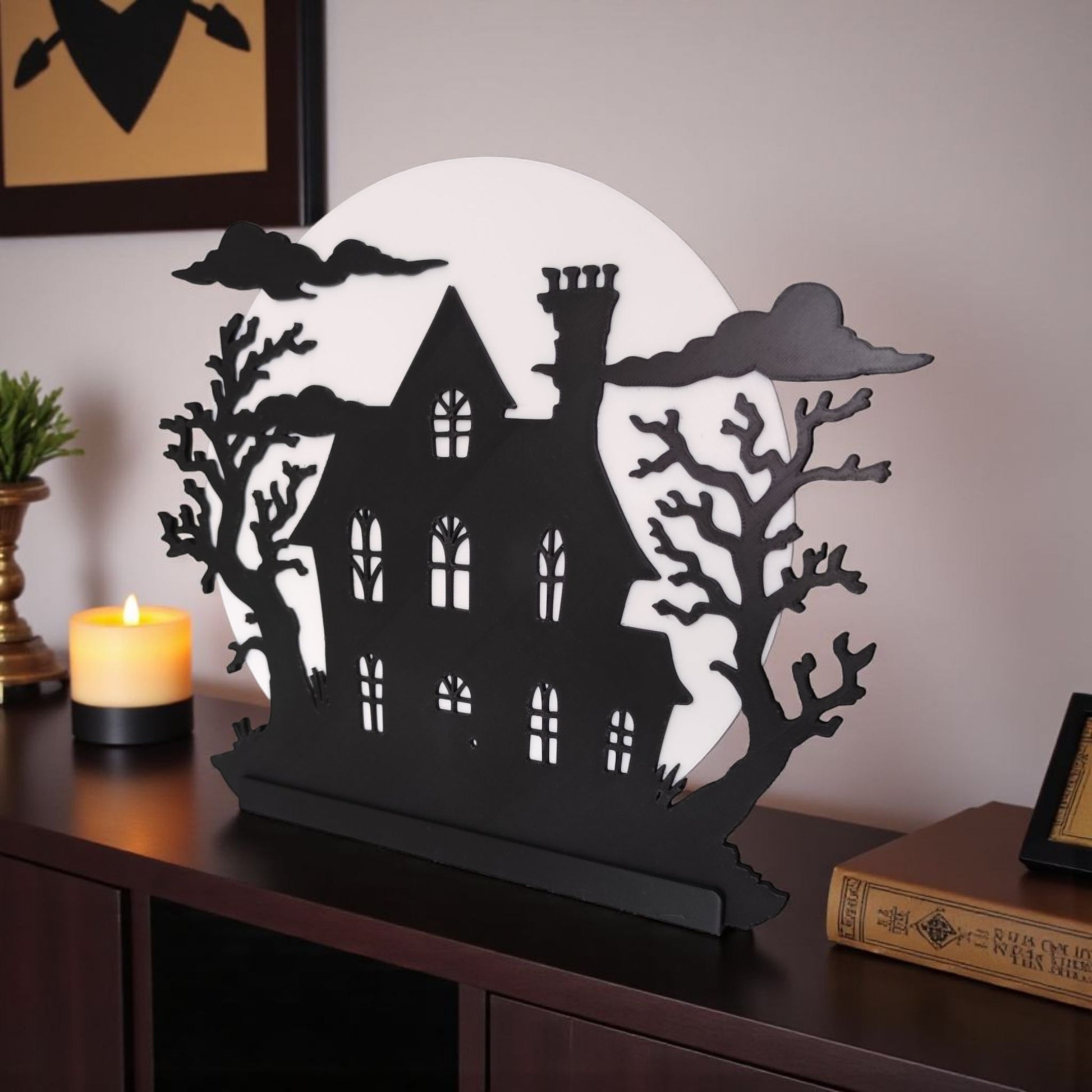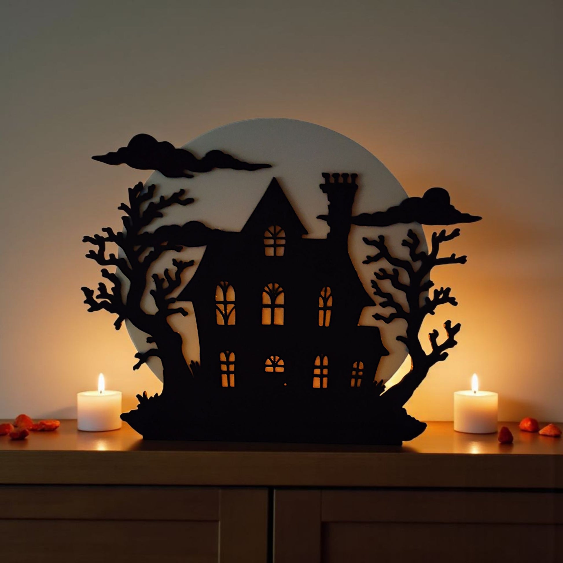 Huset är tryckt med en måninspirerad bakgrund som låter ljuset från ett LED-ljus skimra genom fönstren.